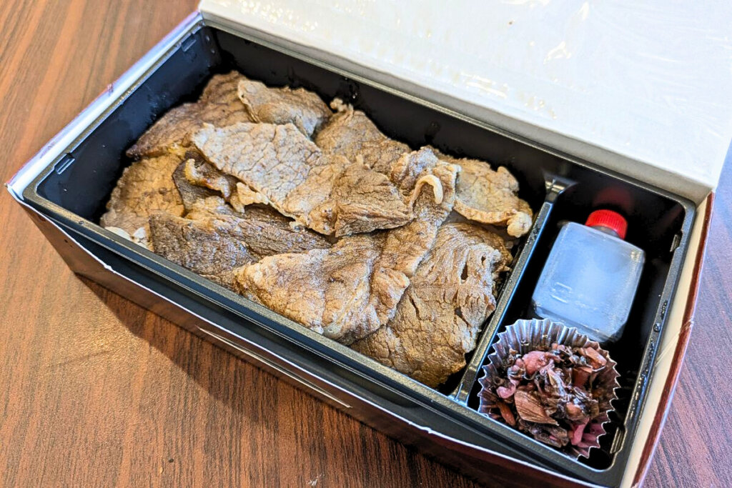 看板商品は、砂糖醤油を塗って直火で網焼きした「牛のあみ焼き」。冷めても美味しく、脂が白く固まらないので弁当にも適しています。
