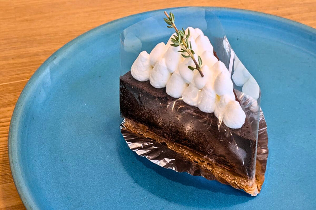 写真の「シャンティショコラ」は、塩の効いたクッキー生地に、ナッツペースト、どっしりとしたチョコがのった人気ケーキ。イベント用でしたが望む声が多く、定番品に。