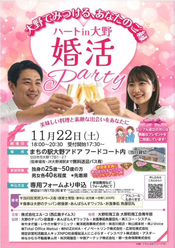 廿日市市大野の「まちの駅ADOA大野」で11月22日(土)、婚活イベント「ハートin大野 婚活Party」を開催します。