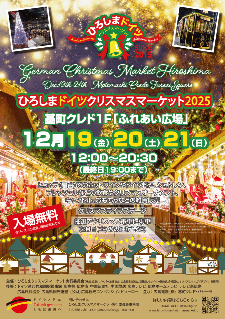広島ハノーバー友好協会、広島独日交流会などによる実行委員会が開催する恒例のマーケット。ホットワイン、ドイツ料理、シュトレンなどの飲食物やクリスマスオーナメント、おもちゃなどの雑貨を販売。ライブステージもあり。20日はクリスマス電車も運行予定です。