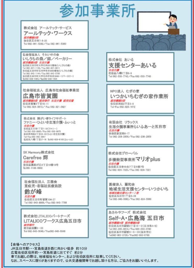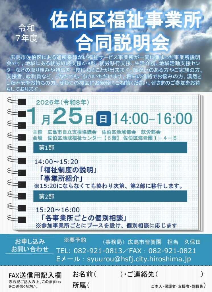 広島市佐伯区やその近郊に住む、障害を持つ人や家族などを対象とした「佐伯区福祉事業所合同説明会」が1月25日(日)、佐伯区地域福祉センターで開催されます。