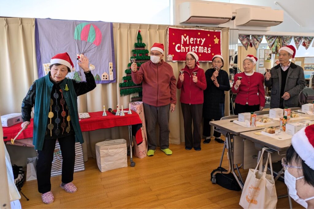 500回目となる今回は、クリスマス会も兼ね、ハンドベルの演奏やケーキを食べながら交流が行われました。当日の参加者は約50人。多い時は70人近くが集まるそうです。